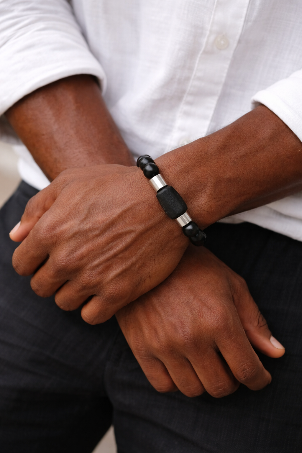 Handcrafted stretch bracelet featuring matte wood beads, polished metal accents, and a raw stone focal. Designed for grounded presence and effortless style.