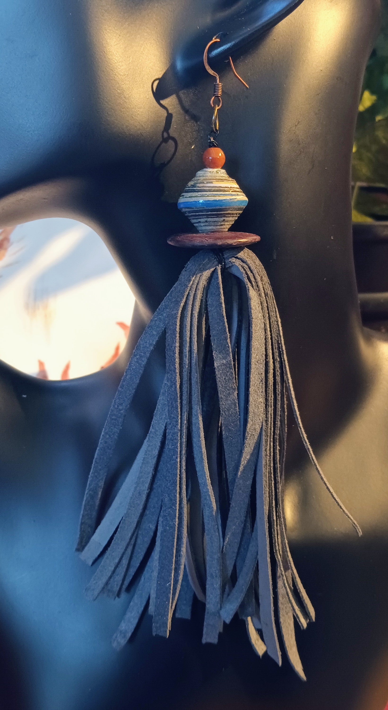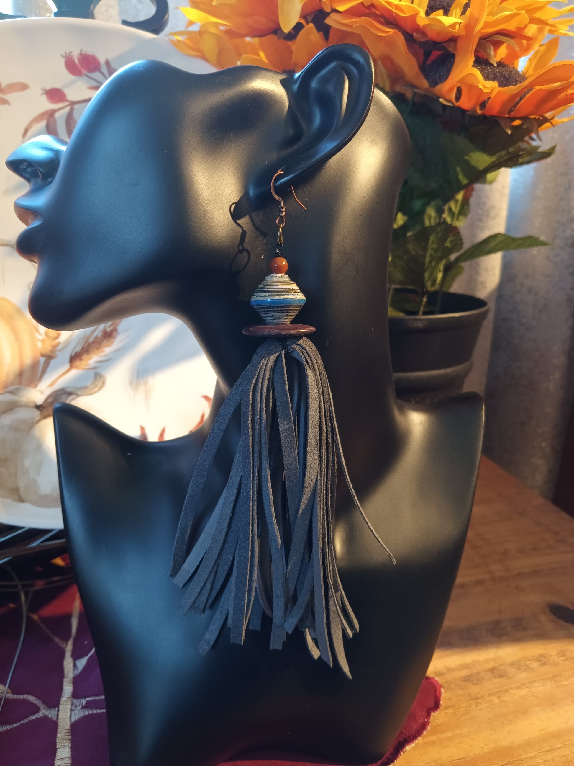 Hand-cut leather fringe, rich fall tones, and artisan beads — these statement earrings were made to turn heads. Light, dramatic, and handcrafted with love, they bring movement, style, and soul to every outfit.