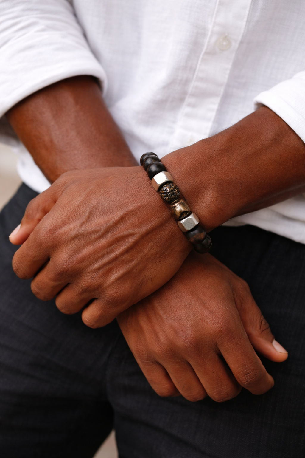 Handcrafted stretch bracelet featuring matte wood beads, polished metal accents, and sculpted focal details. Designed for bold presence and effortless edge.