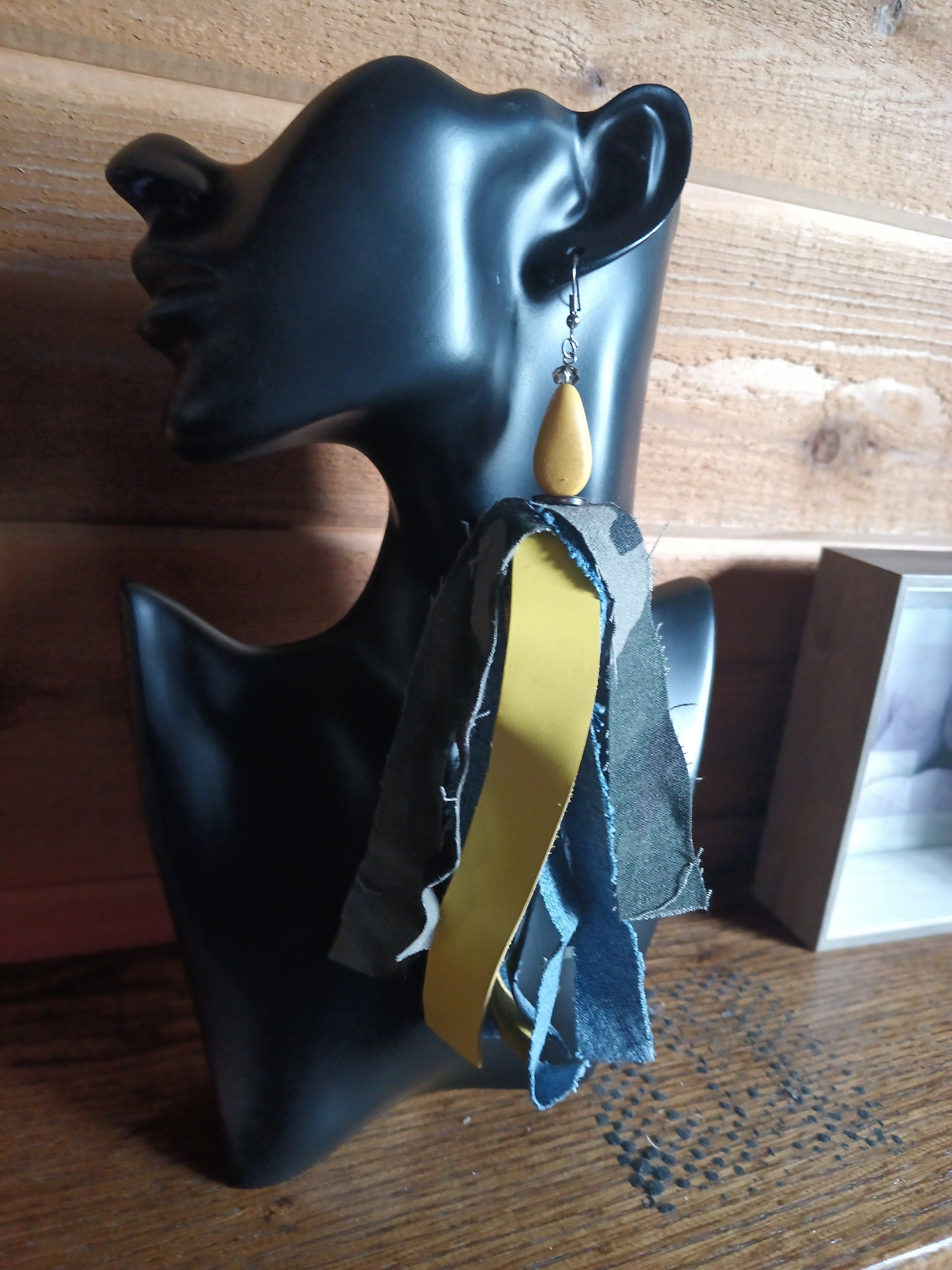 8-inch handcrafted fringe earrings featuring a bold mix of yellow leather, blue denim, and army camo strips. Topped with a uniquely beaded yellow accent, creating a vibrant statement piece with movement, texture, and edge.