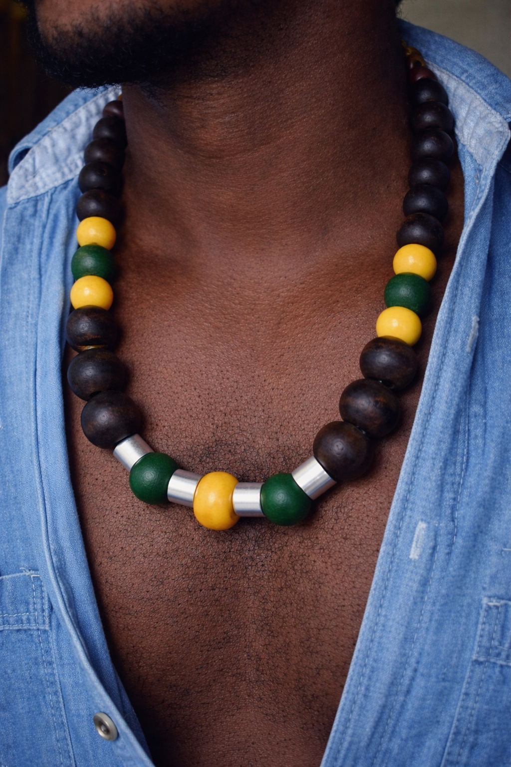 11" long handcrafted beaded necklace featuring yellow, green, and silver tones with grounded, modern energy.